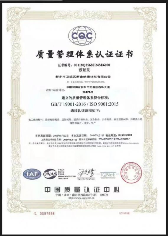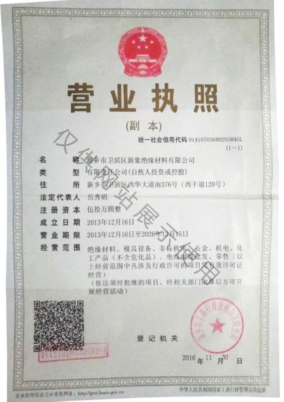 新(xin)鄉市(shi)衛(wei)濱區新(xin)象絕緣(yuan)(yuan)材料有(you)限(xian)公司位于河南省新(xin)鄉市(shi),成立于1958年(nian),主要(yao)生產絕緣(yuan)(yuan)板、絕緣(yuan)(yuan)棒、絕緣(yuan)(yuan)管、絕緣(yuan)(yuan)漆、絕緣(yuan)(yuan)帶、絕緣(yuan)(yuan)膜、絕緣(yuan)(yuan)紙等絕緣(yuan)(yuan)材料及玻璃拉擠模具(ju)(ju),擁有(you)60年(nian)的(de)(de)生產經驗,特別(bie)是生產的(de)(de)環氧管、酚醛布(bu)管及拉擠模具(ju)(ju)具(ju)(ju)有(you)周期短質(zhi)量優等特點。